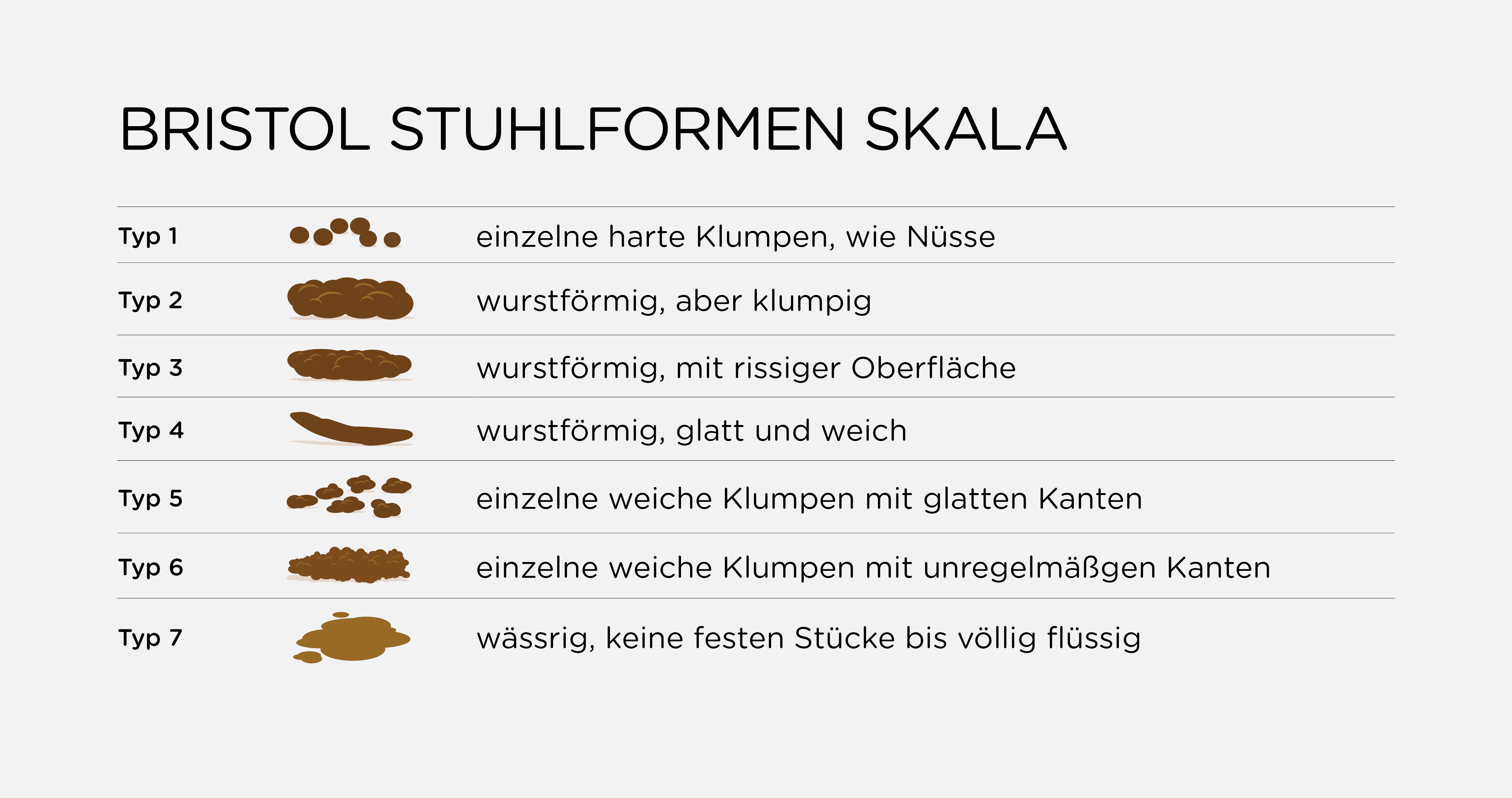 Die Konsistenz des Stuhls kann je nach Nahrungs- und Wasserverbrauch, Lebensstil, körperlicher Bewegung, Medikamenten und Infektionen variieren. Die Bristol-Stuhlskala ist ein Hilfsmittel, das von medizinischem Fachpersonal verwendet wird, um die Beurteilung der Darmfunktion zu unterstützen. Es beschreibt verschiedene Formen und Arten von Stühlen: